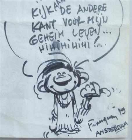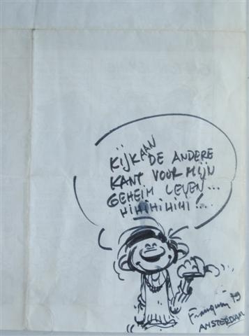 * Gemaakt in de kroeg na een signeersessie toen Franquin met Leo, eigenaar voormalig stripwinkel Richard samen de kroeg indook. Deze toonde hem een gekopieerde parodiepagina van Roger Brunel die Franquin niet kende. Hij waardeerde de grap en maakte er aan de achterkant een tekeningetjes bij.