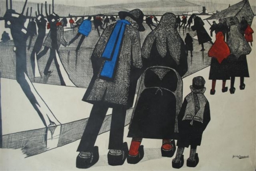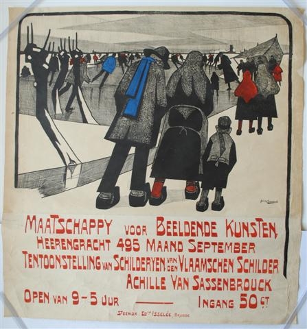 See the Dutch description: A. v. Sassenbrouck, steendruk Ed. Tentoonstellingsaffiche Achille van Sassenbrouck. Isselee, Brugge, 1921. Affiche gemaakt voor tentoonstelling door de Maatschappy voor Beeldende Kunsten, Heerengracht 495, Amsterdam in de septembermaand. Steendruk is contemporain met de hand rood en blauw ingeverfd. 91 x 85 cm.