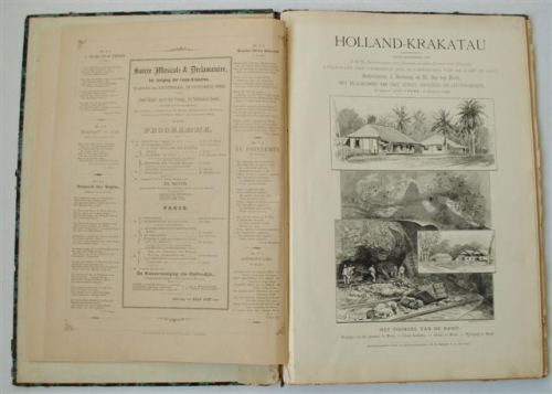 See the Dutch description: Holland - Krakatau. Uitgegeven ten voordeele der slachtoffers van de ramp op Java. Redacteuren: J. Bosboom en Dr. Jan ten Brink. 32 p. Met afb. + Rotterdam - Krakatau. Uitgegeven van wege de Dilettanten-Club te Rotterdam, op den Feestavond van den 13den October 1883, ten voordeele van de slachtoffers in Indie. (totaal 2)