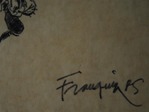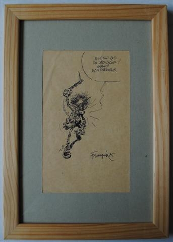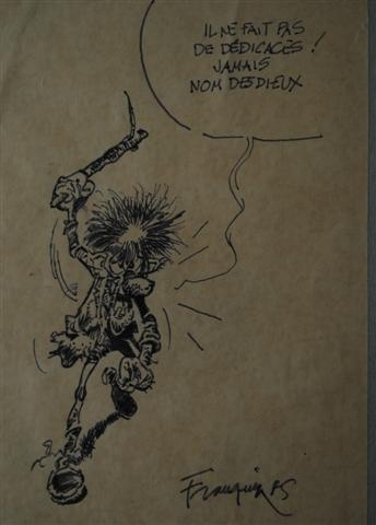 This item contains no English description. See the Dutch description: "Il ne fait pas de Dédicaces! Jamais Nom des Dieux". Gesigneerd Franquin 85. Inkt op Japans papier. 12 x 16,5 cm.