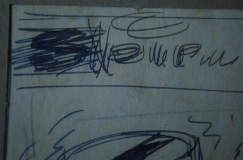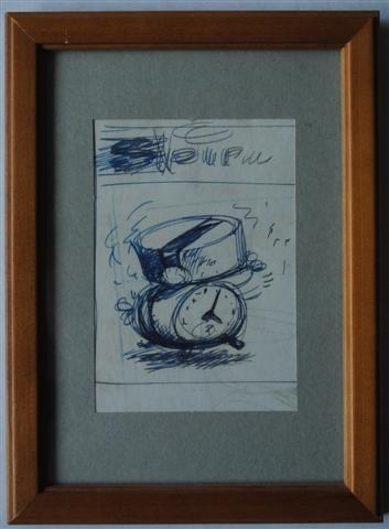 This item contains no English description. See the Dutch description: Voorschetsje Spirou. Blauwe inkt op papier.10 x 6,7 cm.