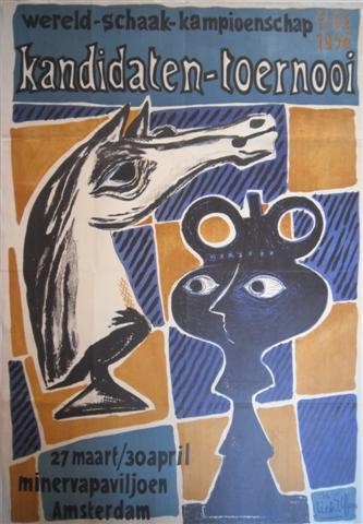 See the Dutch description: Wereld-schaak-kampioenschap, kandidatentoernooi, 27 maart/30 april, minervapaviljoen Amsterdam. 1956. Ontw. Dick Elffers. 99,5x69,5 cm.