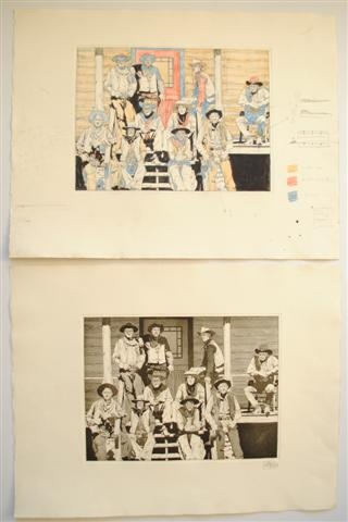 See the Dutch description: Cowboys voor een huis. 30 x 40 cm. Met aanwijzingen van de tekenaar in de marge. Tekening is in 1987 bij drukkerij afgegeven als origineel voor litho's. Hiervan is een proefdruk gemaakt, gesigneerd en gedat. Onbekend is of er meerdere exemplaren zijn verschenen.
