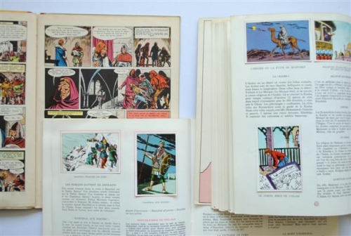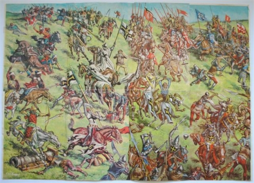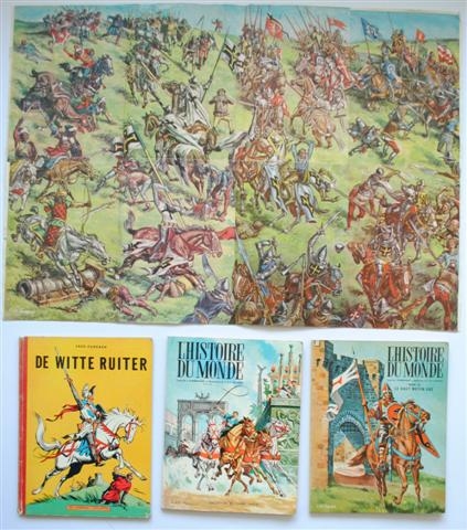 See the Dutch description: Affiche: Slagveld in Riddertijd. Ca. 1964. 53 x 75 cm. Affiche bestaande uit 8 losse platen, op papier geplakt. + De witte Ruiter, Lombard Collecie 1956 (niet storend tape laagje op rug, naam 2e pag.) - en l'histoire du monde tome I & II, Lombard, 1960. Compleet met alle plaatjes.