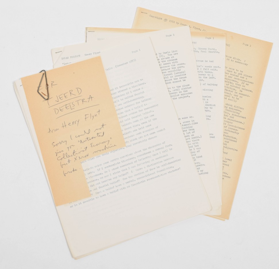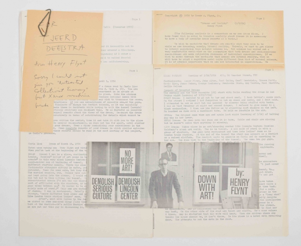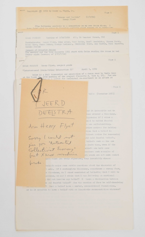 + Various Xeroxed documents from 1972-1974 sent by Henry Flynt to Tjeerd Deelstra in 1974. 32 pp. Includes Flynt's text 'Philosophical Aspects of Walking Through Walls', the 'Dreams and Reality' manuscript, a full transcript of 'Dream Project' among others. A paperclipped note by Flynt mentions that he meant to send even more, but the Xerox machine broke down.