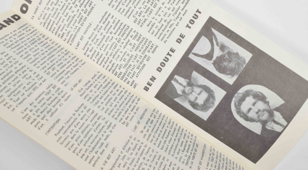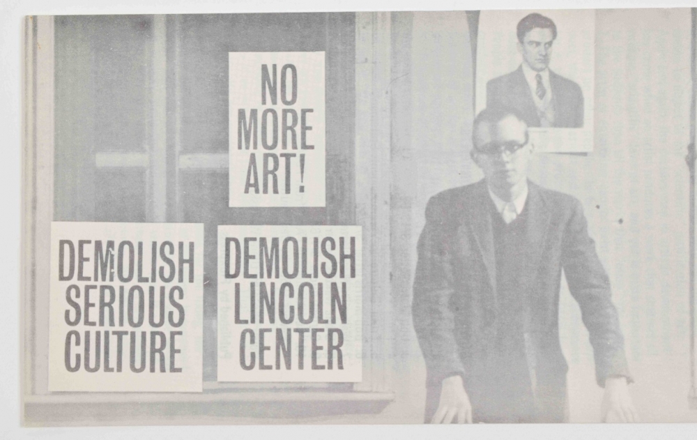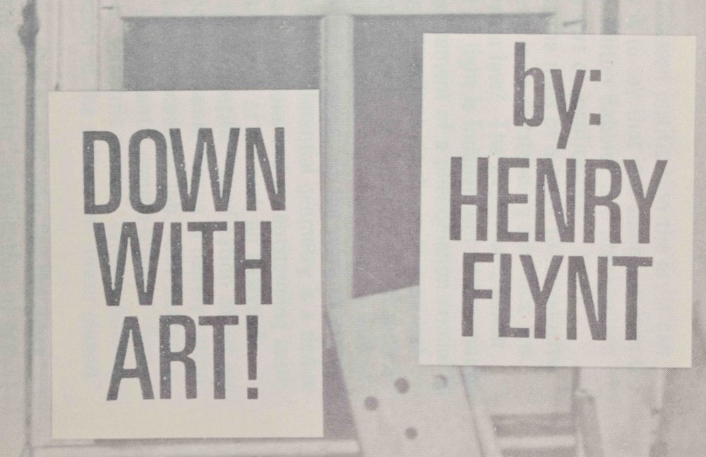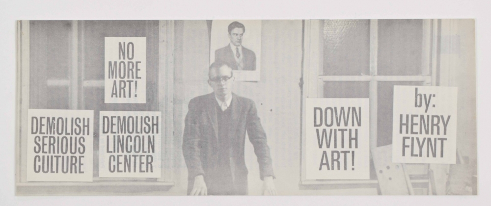 Features the brochure: Down with Art! No More Art! Demolish Serious Culture, Demolish Lincoln Center. New York, Fluxpress, 1968. 27.5 x 10.5 cm, 12 pp. Flynt's first solo publication including his essay 'Art or Brend?'. Also presents artists' statements by Terry Riley, Bob Morris, Walter de Maria, Diane Wakoski, Cornelius Cardew and Ben Vautier. In mint state.