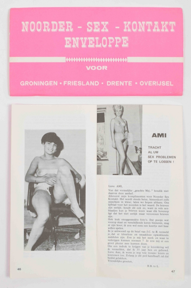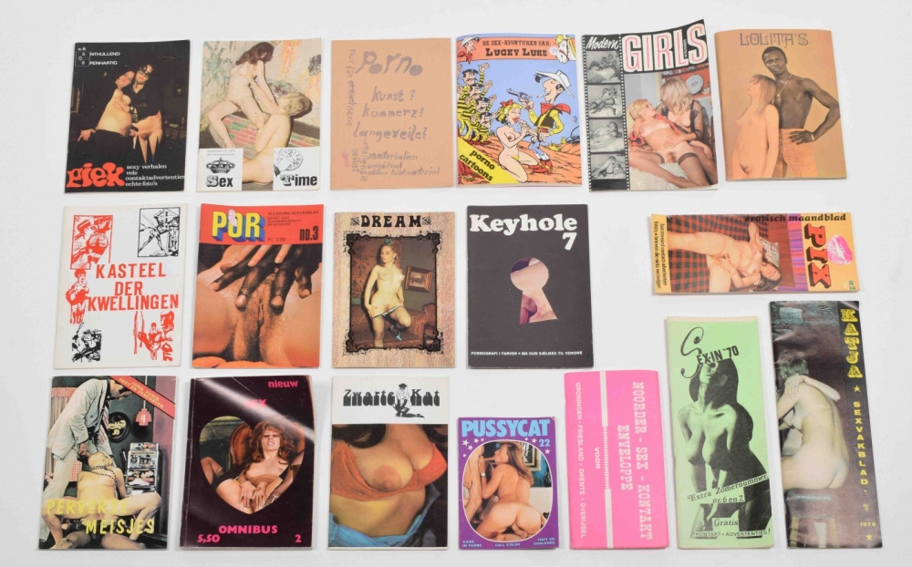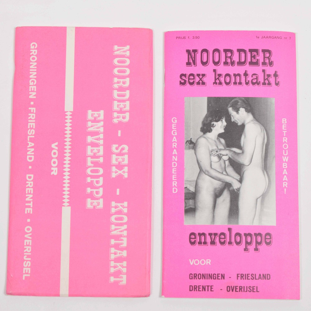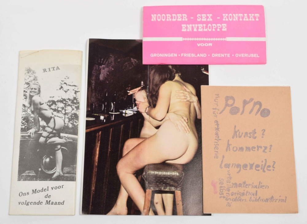 Sex-in '70. Year 1, no. 6/7. Rotterdam, 1970 + Katja. Sexvakblad. No. 5. Utrecht, De Dom, 1970 + Noorder sex kontakt enveloppe. Voor Groningen, Friesland, Drente, Overijsel. Year 1, No.7, Hoogeveen/ Steenwijk, De Lektuurhal, c. 1970. With envelope + Porno. Kunst? Kommerz? Langeweile? Stuttgart, Edition art&porno, c. 1970. Stapled, 16 stenciled pages, 21 x 15 cm. A German review of pornographic papers in Europe, incl. 4 b/w pornographic pictures - and 14 more 70s pornographic publications such as Piek, Sex Time and Lolita's.