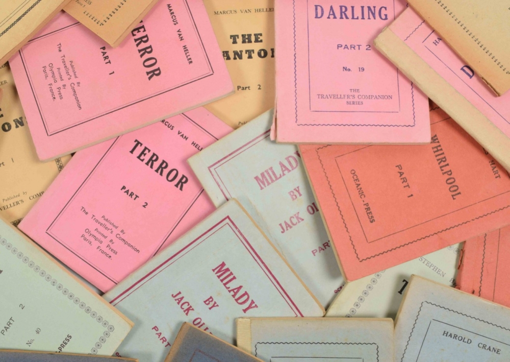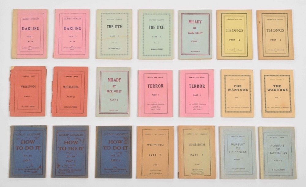 Marcus van Heller. Whipsdom. Part 1 and 2. Othello Books, the Olympia Press, c. 1950. 199 pp. over 2 parts + Carmencita de las Lunas. Thongs. Part I and II. The Traveller's Companion series, c. 1950. 184 over 2 parts. And 17 more, each ca. 14.5 x 9.5 cm.