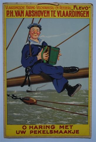 See the Dutch description: Affiche Vlaardingsche Haring-Vischpakkerij en Reederij "Flevo", ca. 1935. P.H. van Abshoven te Vlaardingen. Litho.