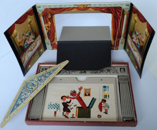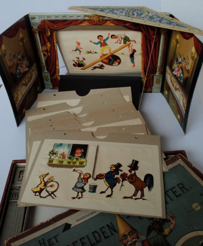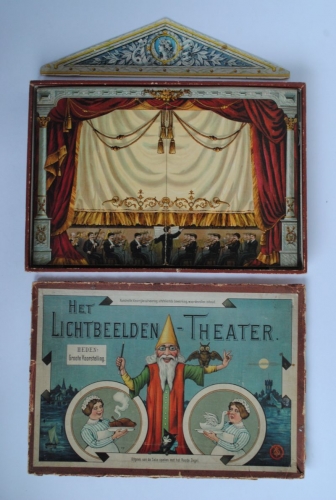 See the Dutch description: Uitgave van de Sala-spelen met het Roode Zegel. Ca 1895. Compleet met 10 lichtbeelden en theatertje (31 x 45 cm). In orig. doos.