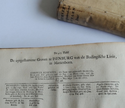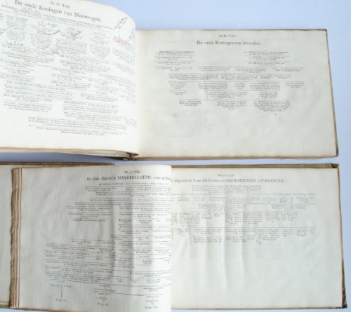 See the Dutch description: beneffens de daar toe behorende geslagt-reken-kundige vragen tot verklaring der staatkundige historie. Leyden, Dirk Haak 1722-1729. Dl. I en II. In volperkamenten bnd.
