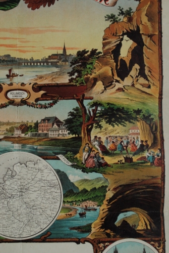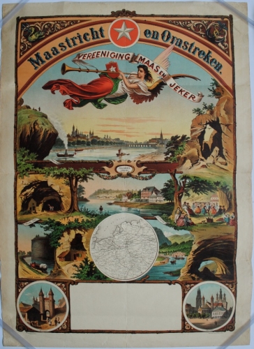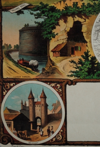 See the Dutch description: F. van de Laar, Impr. Artist. Orell Fussli & Co, Zurich.1891. Litho, met afbeeldingen van de St Pieter, Luiker Kanaal, Helpoort, Vrythof etc.