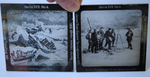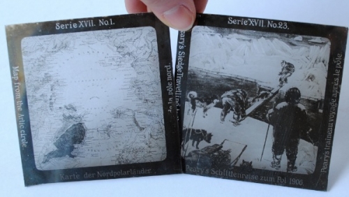 See the Dutch description: Duitsland, ca. 1910. 24 Glasplaatjes, met voorstellingen van Parrys skireis uit 1821 t/m Peary op de Noordpool uit 1909.