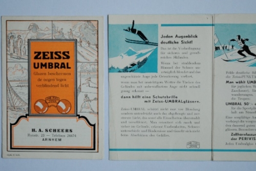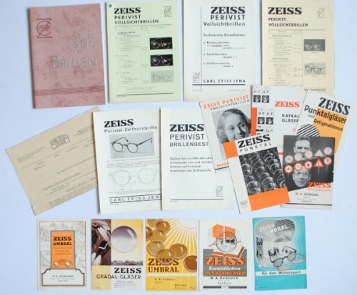 This item contains no English description. See the Dutch description: Jena, ca. 1933. + begeleidende brief en 5 folders over Perivist brillen + 11 div. uitklapfolders van Zeiss uit de jaren '30.
