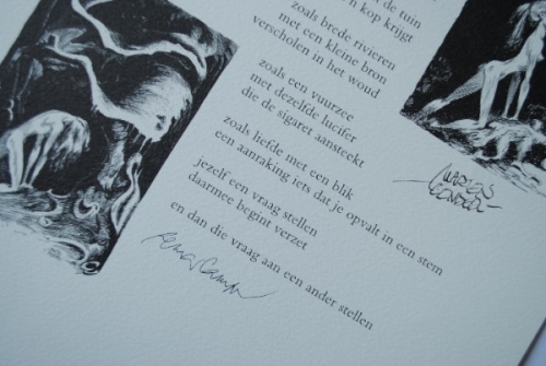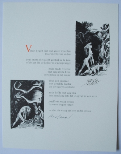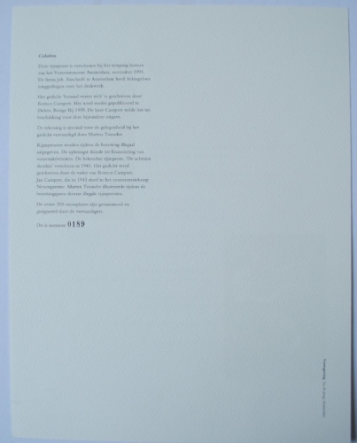 See the Dutch description: Verzetsmseum Amsterdam 1995. Gedrukt door Joh. Enschedé. Tekening speciaal voor de gelegenheid bij het gedicht vervaardigd door Marten Toonder. nr. 189 van 200. Gesigneerd door auteur en tekenaar.