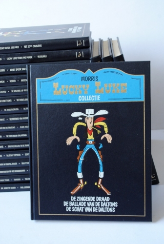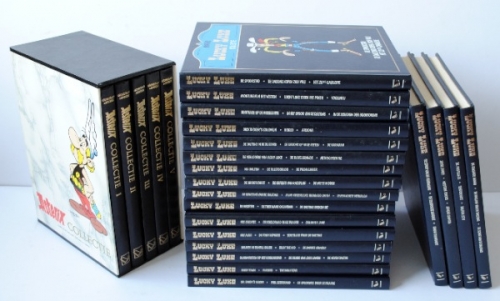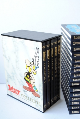 See the Dutch description: Lekturama, 1989, met de eerste 28 verhalen van Asterix + Hoe de kleine Obelix in de ketel van de druide viel en Asterix en de verrassing van Caesar. In 5 banden in schuifdoos- en Lucky Luke, Bundelingen, Lekturama 1988-90, compleet in 20 dln.