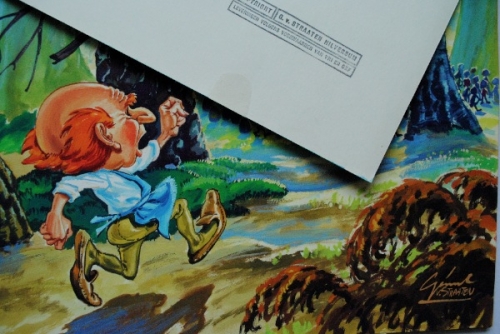 See the Dutch description: Gebruikt voor filmstrook uitgave ca. 1965. Tekst Harry Baljet, Tekeningen Gerard van Straaten. Compleet verhaal in 24 originele gouaches. 22 x 32,5 cm.