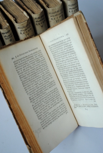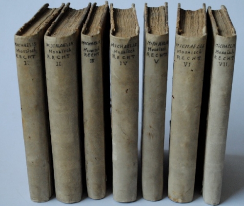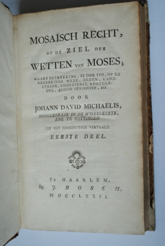 See the Dutch description: Michaelis-Mosaisch Recht, of de ziel der wetten van Moses; (..), door Johann David Michaëlis, hoogleeraar in de wysbegeerte, enz. te Gottingen, Haarlem, J. Bosch, 1772-78. Deel 1-7. Deel 7 bestaande uit byvoegsels en verbeteringen op het mosaïsch recht. Voor aan is geplaatst Een verhandeling over het Offeren van Menschen van Jaco Bryant en achter aan eenige byzonderheden over de oudste geschiedenisse der Paarden en Stoeteryen in Palaestina en de nabuurige landen, inzonderheid Aegypen en Arabien.