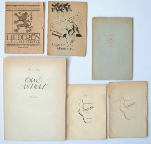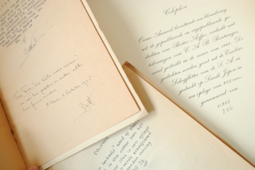 See the Dutch description: Bertus Aafjes-Omne Animal, gedichten. 1944. Nr. 256 van 275. Tekeningen Bantzinger. + Jan Spierdijk XVI sonnetten, 1945. Nr. 29/50 gesign. met opdracht. + Amsterdamsche Kwatrijnen, in oplage van 5 genummerde exemplaren. Exemplaar voor Tine (= Tientje Louw) " die heele mooie vrouw".... in wier huis poeëten en ander volk hun forum vinden. A'dam, 8 oktober 1945. + Amsterdamsche kwatrijnen, Bert Voeten, 1945. Omslag en tekening Tientje Louw, oplage 200. Eén van de 15 Romeins genummerde ex. voor Tinus (=Tientje Louw) met opdracht. - en 2 andere
