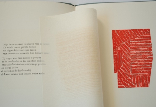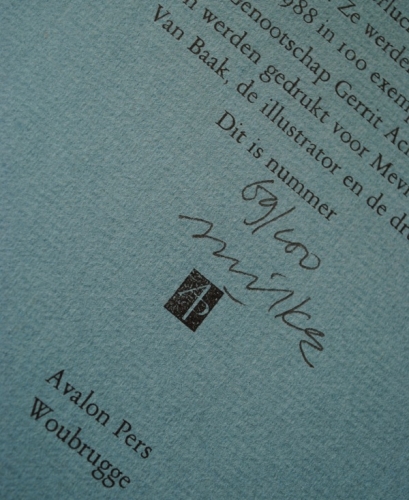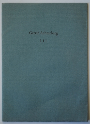 See the Dutch description: Drie ongebundeld gebleven gedichten van Achterberg. Verlucht met drie kartondrukken van Willem Snitker. Gezet uit de Romanée. Avalon Pers, Woubrugge voor Stichting Genootschap Gerrit Achterberg, 1988. In 100 ex., waarvan deze nr. 69, gesign. door Snitker.