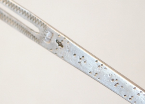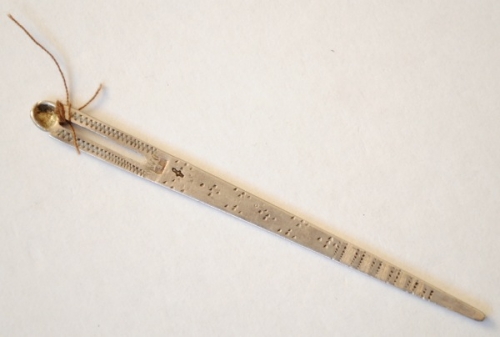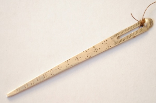 See the Dutch description: Ca. 1800. Twee merkjes. Platte naald (circa 7,2 cm) zonder scherpe punt met een lang oog, in de 18e en 19e eeuw gebruikt om korsetten dicht te rijgen of band door schuif te trekken.