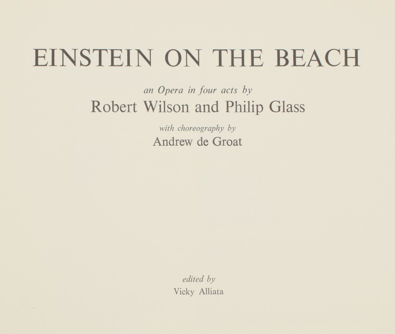 An Opera in four acts by Robert Wilson and Philip Glass with choreography by Andrew de Groat. New York, EOS Enterprises Inc, 1976. 22 x 28 cm. Artists' book celebrating Glass's seminal first operatic work, and alternates illustrations of the score with librettos and drawings representing Robert Wilson's stage design and Andrew de Groat's choreography.
