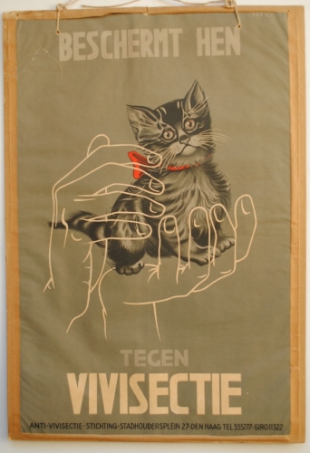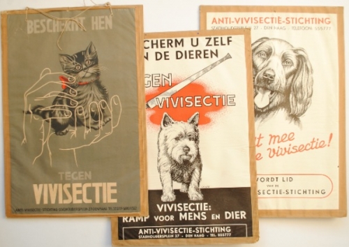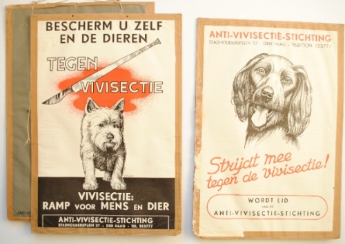 See the Dutch description: Anti-vivisectie stichting den Haag. Beschermt Hen Tegen Vivisectie. Pax Steen + Bescherm u zelf en de dieren tegen vivisectie. Creare + Strijd mee tegen de vivisectie, Creare. Ca 1950. Alle 44 x 64 cm. Met bruin dun karton aan randen op board gespannen.
