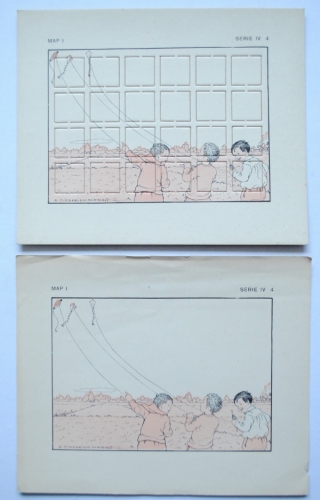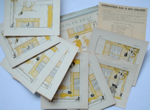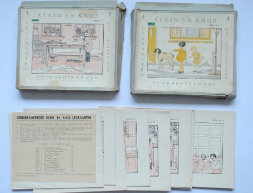 See the Dutch description: Klein en Knus voor Broer en zus. Ca. 1930. Legkaarten met voorbeelden. Serie VIII en IV. Doos met opgeplakte plaat, waarin 4 voorbeeldkaarten en 4 puzzels. In goede staat.