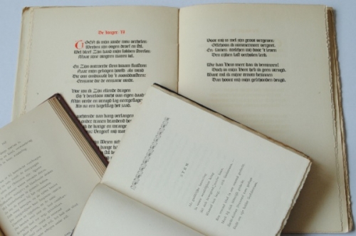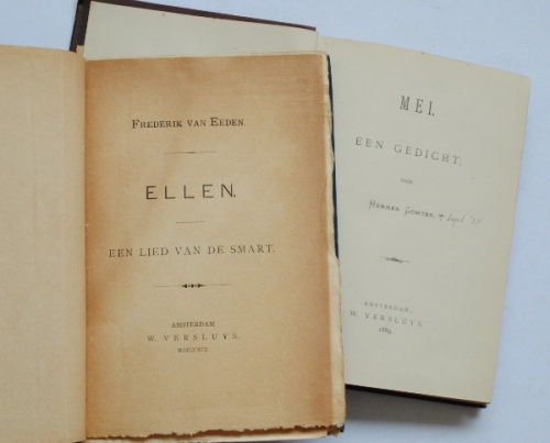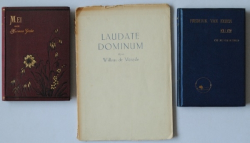 See the Dutch description: Herman Gorter, Amsterdam, W. Versluys, 1889. Eerste druk. In orig. decoratieve band. Mooi ex. + Ellen, Een lied van Smart. Frederik van Eeden, W. Versluys, 1891. Eerste druk. - en Laudate Dominum, Willem de Mérode, Culemborg, de Pauw, 1931. Nr. 50 van 125. Op Hollandsch papier van Pannekoek. Rug bovenz. besch.