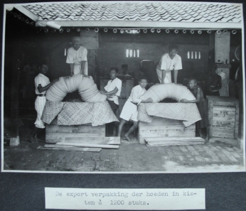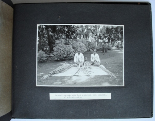 See the Dutch description: "Het tjappen van Batiks" , "Desa-vrouwen aan het spouwen van pandan-vlechtstrooken", "Het etablisement van een hoeden-opkooper", etc. Album met 20 pagina's, op elke pagina een foto met onderschrift.