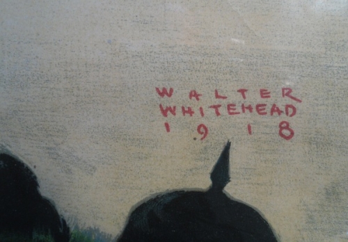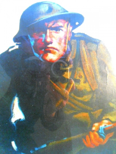 Propagandaposter uit de Eerste Wereldoorlog. Een gewonde Engelse soldaat stapt over een dode Duitse soldaat, met zijn bajonet in de aanslag. Afm. 77 x 51 cm. Affiche in lijst. Kl. scheurtjes in o.marge, verder goed ex.