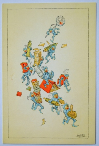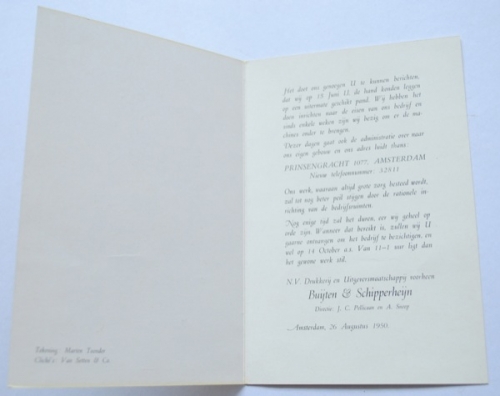 See the Dutch description: Amsterdam, 1950. Tekening Marten Toonder, Cliché's Van Setten & Co. Uitklapkaart met gedrukte tekst over de verhuizing naar Prinsengracht 1077.