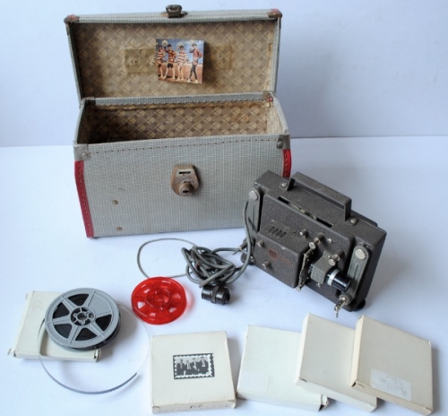 This item contains no English description. See the Dutch description: 8mm projector met 5 originele filmpjes van de Beatles, o.a. I Dig a Pony, 1969. Zwart wit films in orig. doos.
