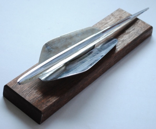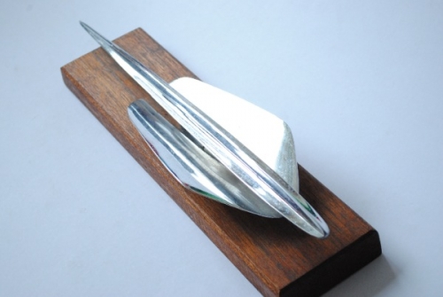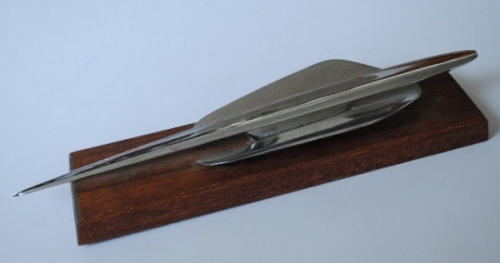 This item contains no English description. See the Dutch description: Auto mascotte chroom, op houten sokkel.