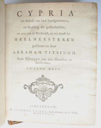 See the Dutch description: tot Schrik van haar bondgenooten, en Redding der gestruikelden; ter eerre van de Heelkonst, en tot dienst der Heelmeesteren. Abraham Titsingh, Stads Chirurgyn van den Gerechte te Amsterdam, Johan Gysius, 1742. 2 Vols. 540 + 630 p. in orig. leren banden.