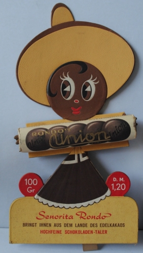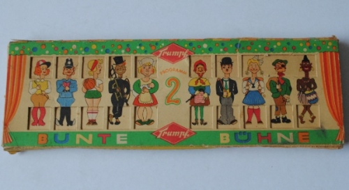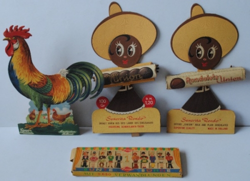 See the Dutch description: Korffs Chocolade, Amsterdam. Haan. + Union Chocolade: Senorita Rondo, gemaakt voor de Engelse markt en Duitse markt. - En Trumpf Programma 2 - Bunte Bühne. Kartonnen schuifdoosje.