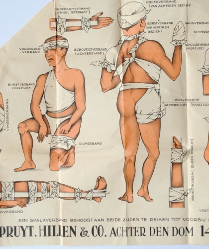 See the Dutch description: Driehoekig affiche als mitella vouwbaar, met afbeeldingen en uitleg van plaatsing van verbanden. Gevouwen. 63 x 132 cm