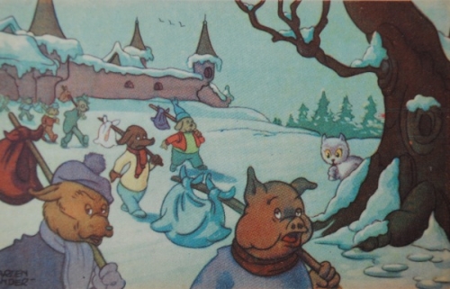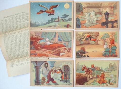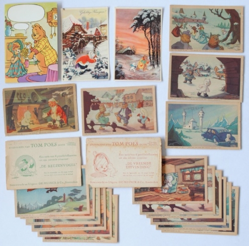 See the Dutch description: Serie van 6 prentbriefkaarten uit het zevende avontuur: De Reuzenvogel, in originele wikkel. De Muinck & Co, 1943. (Santbrink, 67; 33) + serie "De vreemde Uitvinding" compleet met wikkel + 5 div. kaarten uit de reeks - en 3 andere kaarten, o.a. gratis uitklapwenskaart Amro bank als introductie op de reeks die ze in 1974 uitbrachten.