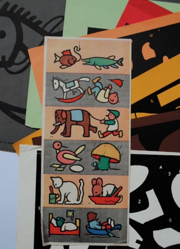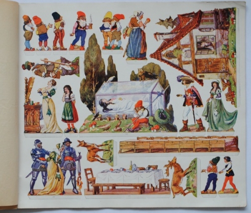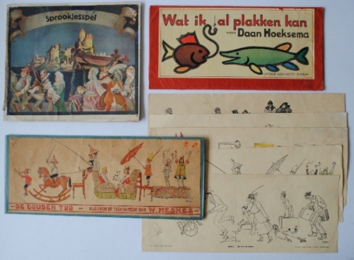 See the Dutch description: Bouwplaten van de sprookjes Doornroosje, Sneeuwwitje, Asschepoester, en drie aanvullingspagina's met decors en edelvrouwen, ridders, etc. Voorblad verstevigd aan achterzijde, rug gerest. + De Gouden Tijd, Kleuren op Teekeningen van Wim Heskes, uig. Gebroeders Koster, Amsterdam. Langwerpig mapje met tekeningen, ca. 1920. - en Wat ik al plakken kan van Daan Hoeksema, uitg. Gebr. Koster, Bussum, in orig. map.