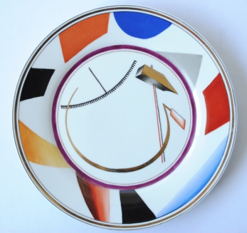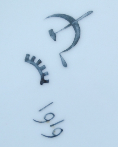 This item contains no English description. See the Dutch description: Gemerkt Hamer Sikkel, & stuk van rad, 1919, in zwart. Latere uitvoering, datering onbekend. Diameter 27 cm.