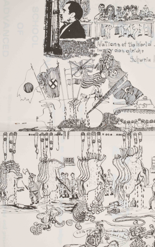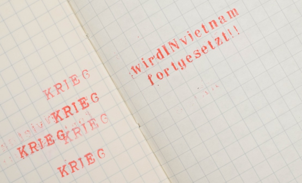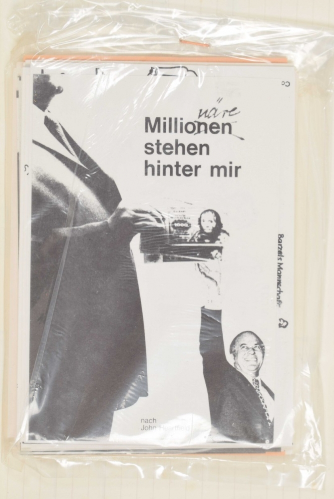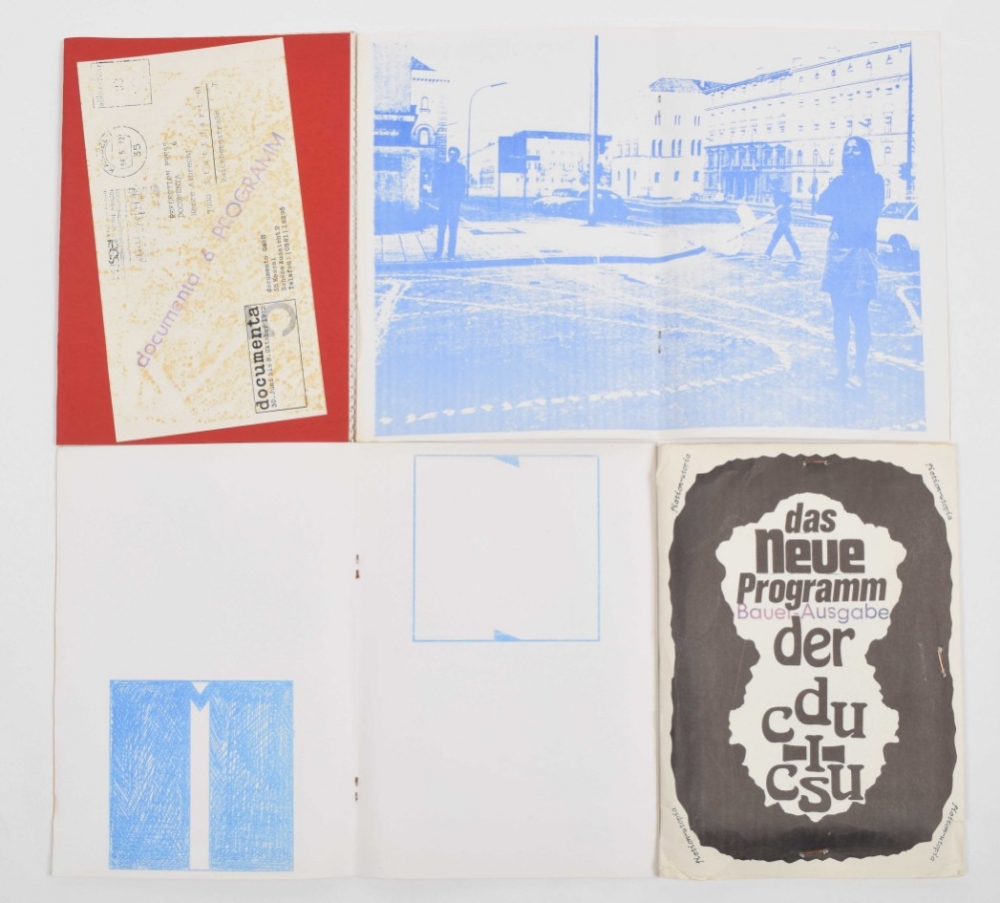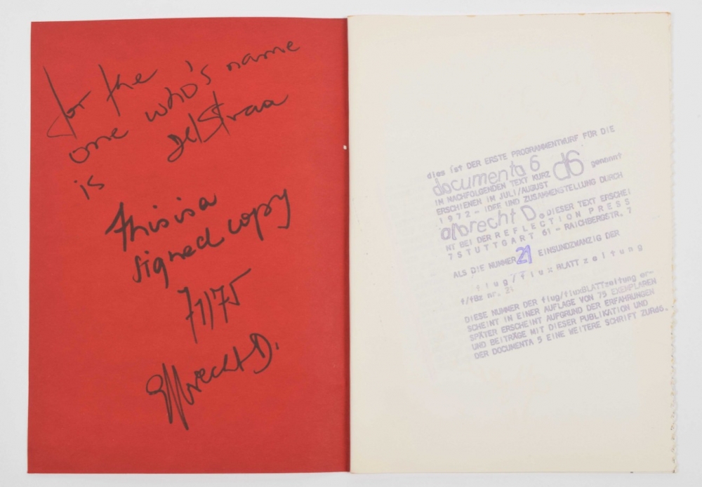 Contains: No.3 and No.5 Wolf Vostell. + No.6 Dick Higginns. + No.9 + No.11, Krieg (War). + No.12 and No.13. Guerilla art action group + No.14 Ben Vautier, A little book of Ben, 1970. + No.15 Eine sammlung von flugblattern, includes a print by John Furnival. + No.16 Collages. + No.17 Gunter Saree. + No.18 Das neue programm der CDU/CSU. + No.19 Postcards. + No.21 Documenta 6 Programm von albrecht/d. Signed copy 'for the one who's name is Deelstra.' numbered 71/75. + No.23 Extra Documenta 6. + No.28 Suzuki. + No.29 Dick Higgins on Something Else Press. + Seven unnumbered publications including Raoul Hausmann's 5 dada-manifests and John Cage's Fictive Interview from 1969. (total 24)