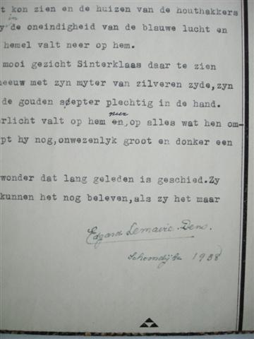 This item contains no English description. See the Dutch description: E. Lemaire-Dens, Schoondijk, 1938. Obscure prive-uitgave, getypt verhaal, 8 pag. In bandje van (nep?)slangenhuid. Met signatuur.