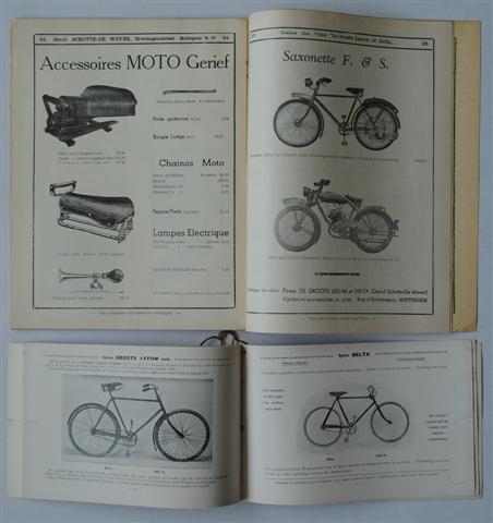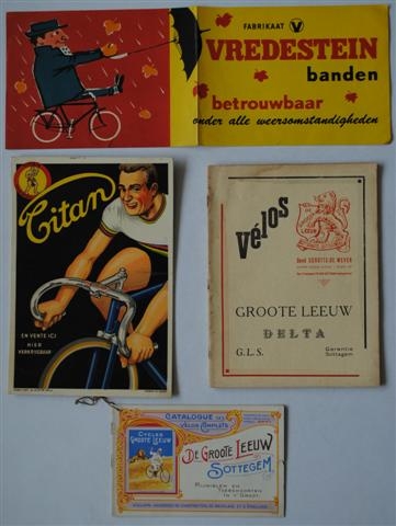 See the Dutch description: Catalogus De Groote Leeuw, Sottegem. Rijwielen en Toebehoorten In t'Groot. Sottegem, ca 1913. 16 pag. + plakaat (op karton) Titan fietssturen, handelscatalogus Groote Leeuw, ca. 1925, 100 pag. en een klein affiche van Vredestein banden.