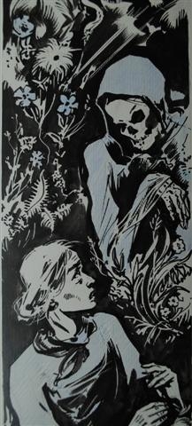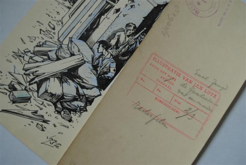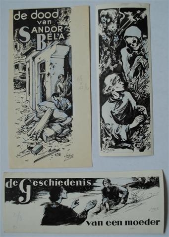 See the Dutch description: 3 originele pentekeningen. 'De dood van Sandor Bela.' 26 x 13 cm. Inkttek. voorplaat verhaal. Met blauwe steunkleur. Gepubl. in tijdschrift Eucharistische Jeugd (verschenen tussen 1948-1958) + Voorplaat en eerste illustratie 'De geschiedenis van een moeder.'