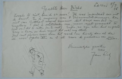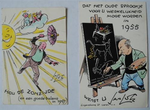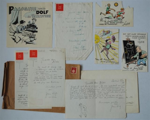 See the Dutch description: Correspondentie aan zijn uitgever. 4 brieven op briefpapier van Lutz aan de heer Dirks die destijds de grafiek verzorgde voor uitgeverij Helmond. De relatie was goed, Lutz kwam regelmatig bij Dirks over de vloer en stuurde ook zelfontworpen kerstkaartjes waarvan 3 in dit lot zijn gevoegd. + een originele tekening 'Paasgave van Dolf de Batavier.'