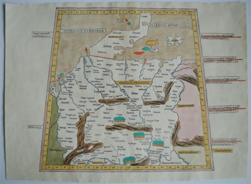 Klassieke Ptolemaeuskaart. Nieuw gekleurd. Voorstellende het huidige Duitsland met delen van Scandinavie, Nederland, Tsjechie, Oostenrijk enz.
