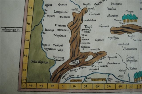 See the Dutch description: Quarta Europe tabula continet Germaniam... Cosmographia. Claudius Ptolemaeus. Ulm. 1482. Leinhart Holle. gekleurde houtsnede. 41 x 56 cm.