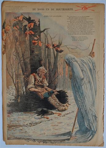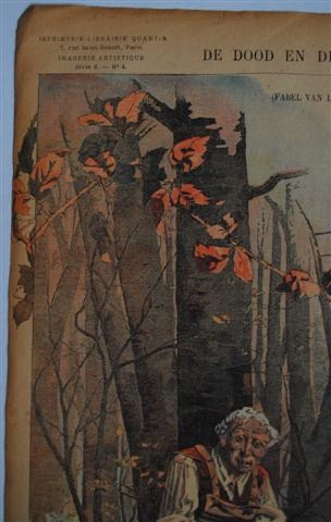 See the Dutch description: De dood en de Houthakker. Paris, Imprimerie-Librairie Quantin. Imagerie Artistique Serie 6, no 4. Fabel van La Fontaine, Michelet, 1888. Chromotypografie.