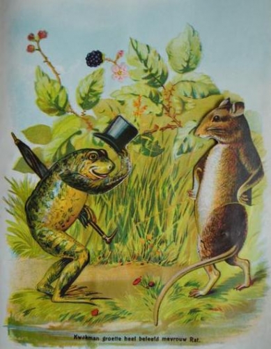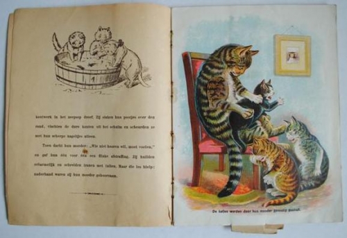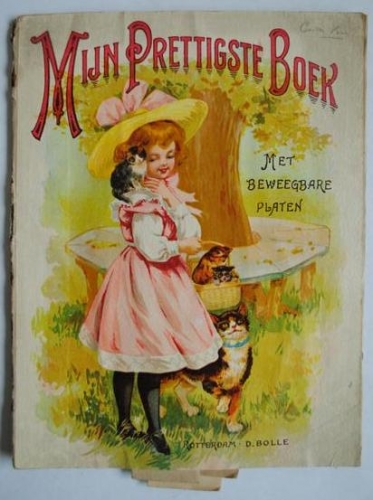 See the Dutch description: Mijn Prettigste Boek. Rotterdam, D. Bolle, ca 1890. Verhaaltjes over dieren. 10 pag. met 4 gelith. beweegbare platen met voorstellingen van drie katjes, geit en hond, drie beren en een kikker en een rat.