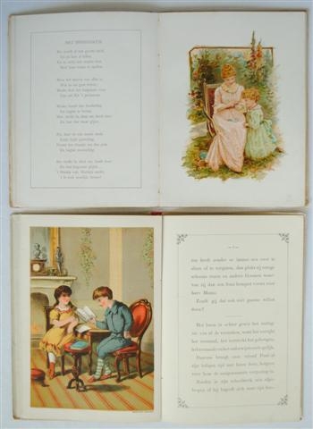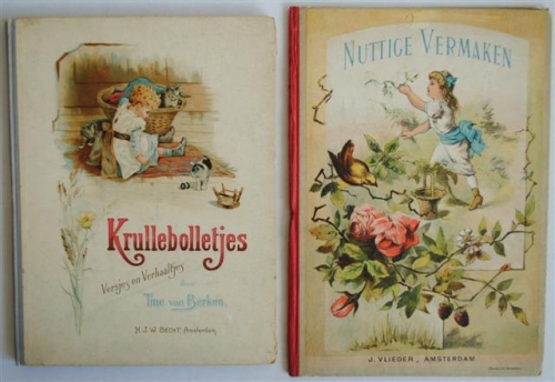 See the Dutch description: Nuttige Vermaken. Met acht platen. [Litho's]. Amsterdam, J. Vlieger, z.j. 16 p. H. Linn. Blok wat los in band. + BERKEN, TINE VAN. Krullebolletjes. Versjes en verhaaltjes door -. Amsterdam, Becht, z.j. [geen pag.] Met litho's. H. linn. (totaal 2)